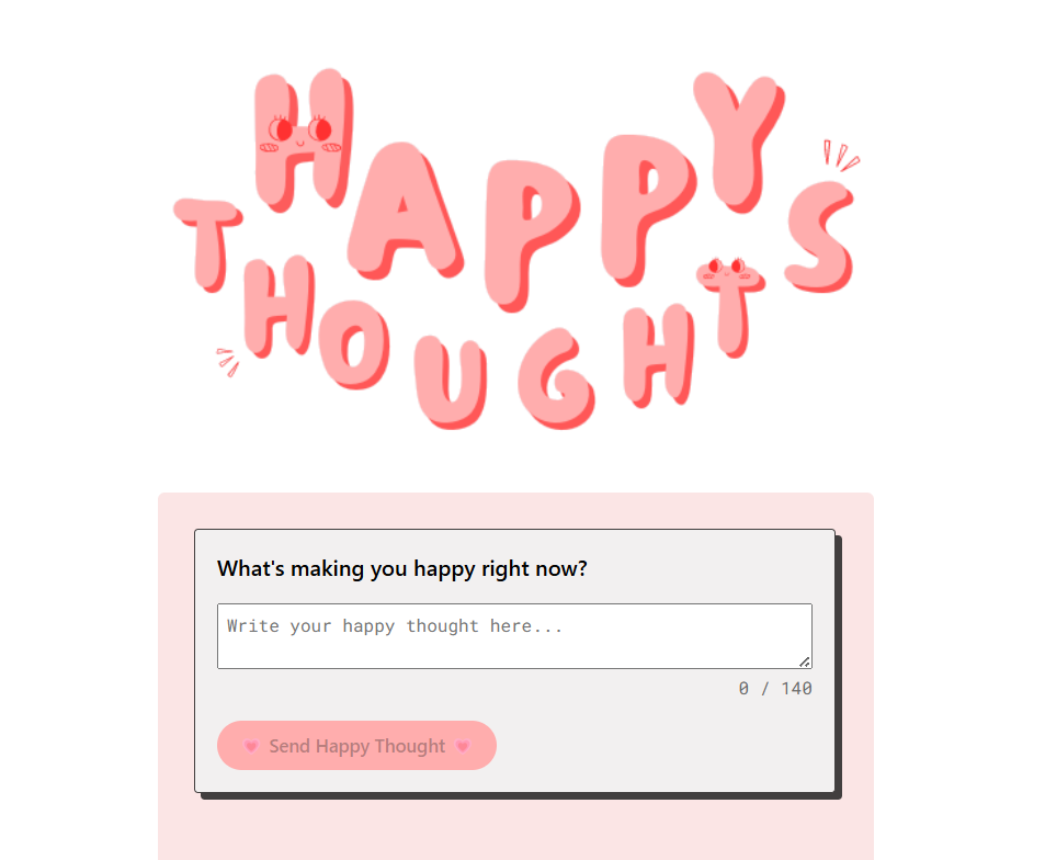 A cheerful spin on social media, Happy Thoughts is a Twitter-inspired app designed exclusively for sharing positivity. Developed during the Technigo Web Development Bootcamp, the app began with an external API integration, handling both GET and POST requests to display and submit messages. Later, I built and connected my own backend using Express and MongoDB, giving me full control over the data and deepening my understanding of full-stack development.
